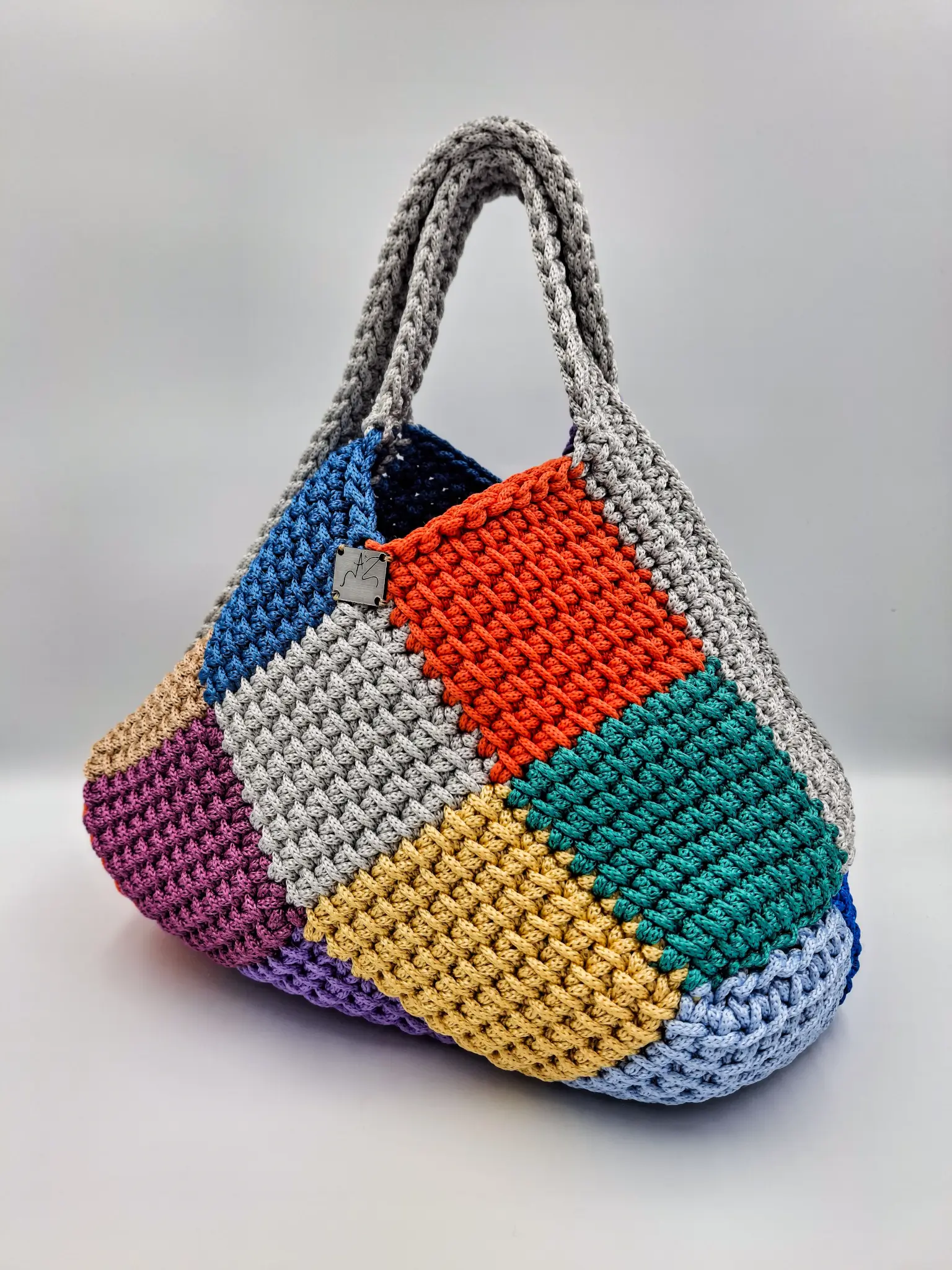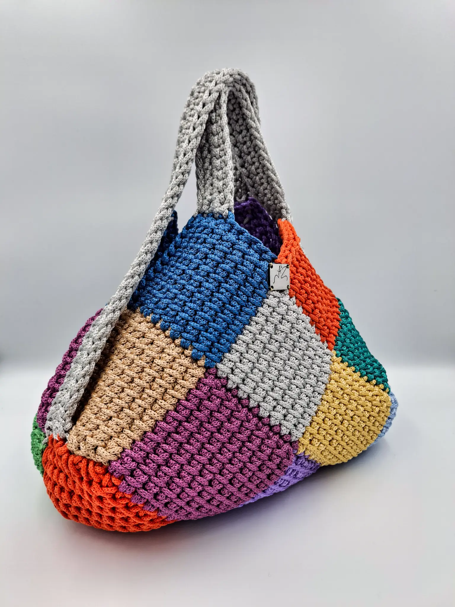 Αυτή η μοναδική χειροποίητη τσάντα παζλ είναι πλεγμένη με πολύχρωμα νήματα σε διάφορες αποχρώσεις, δημιουργώντας ένα ζωντανό και εντυπωσιακό αποτέλεσμα. Το πυκνό σχέδιο βελονιάς της προσφέρει δομή και ανθεκτικότητα, ενώ το ιδιαίτερο σχήμα και οι χοντρές λαβές την καθιστούν πρακτική και κομψή για καθημερινή χρήση.