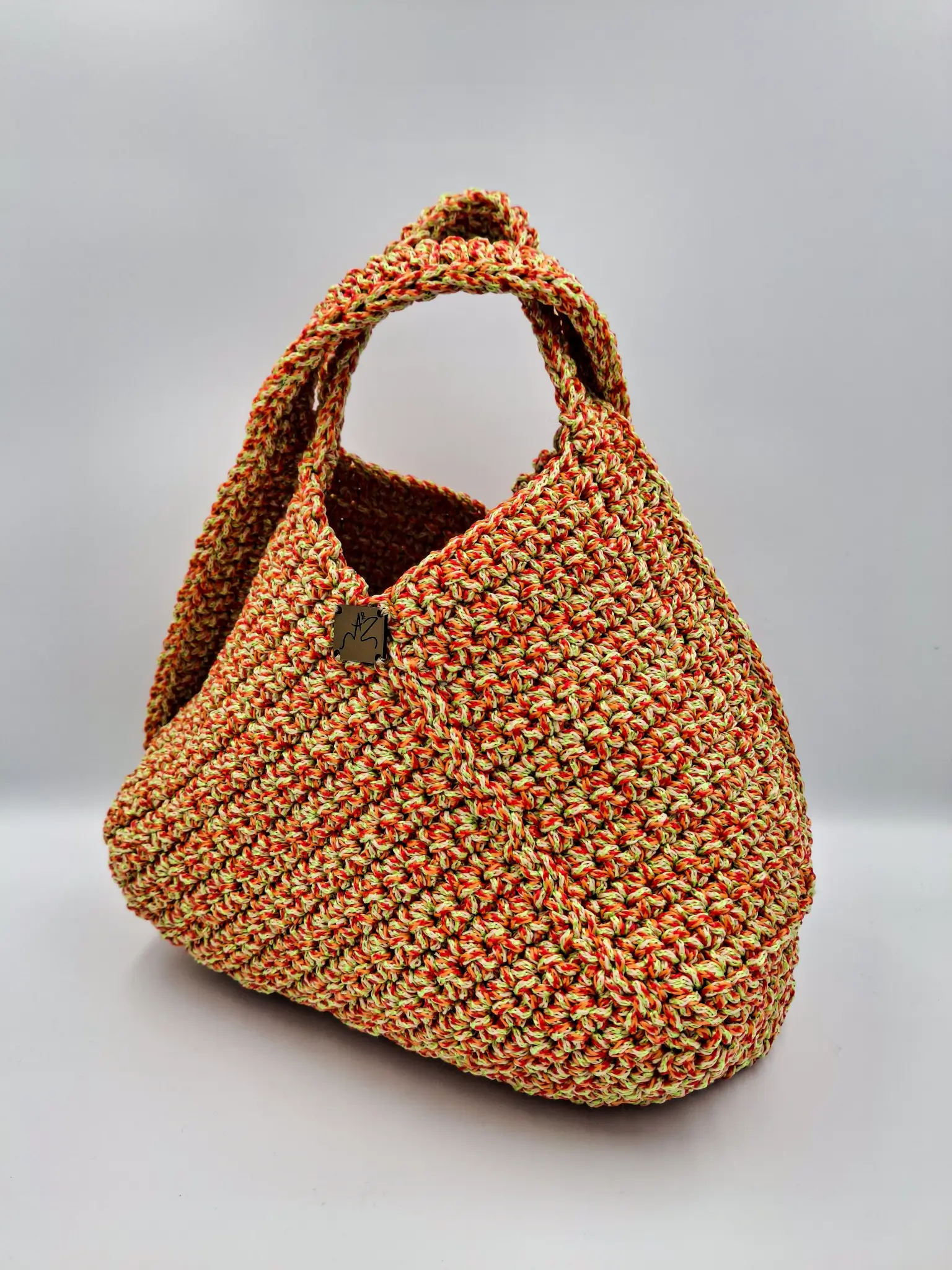 Αυτή η μοναδική χειροποίητη τσάντα παζλ είναι πλεγμένη με πολύχρωμα νήματα σε διάφορες αποχρώσεις, δημιουργώντας ένα ζωντανό και εντυπωσιακό αποτέλεσμα. Το πυκνό σχέδιο βελονιάς της προσφέρει δομή και ανθεκτικότητα, ενώ το ιδιαίτερο σχήμα και οι χοντρές λαβές την καθιστούν πρακτική και κομψή για καθημερινή χρήση.