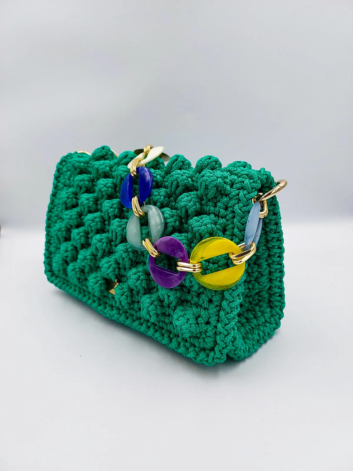 Προσθέστε μια πινελιά τέχνης στην εμφάνισή σας με αυτή την εκπληκτική χειροποίητη τσάντα, κροσέ, για όσους εκτιμούν το μοναδικό σχεδιασμό και την εξαιρετική δεξιοτεχνία. Η απαλή υφή του που μοιάζει με φυσαλίδες και το έντονο λουράκι με αλυσίδα δημιουργούν μια μοντέρνα αλλά και διαχρονική αισθητική.