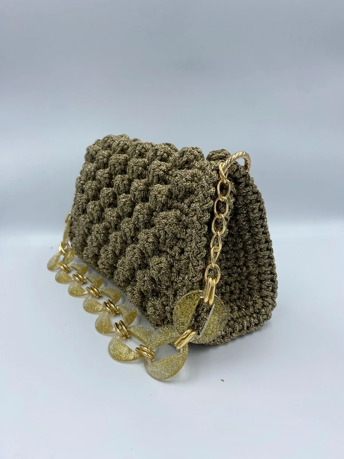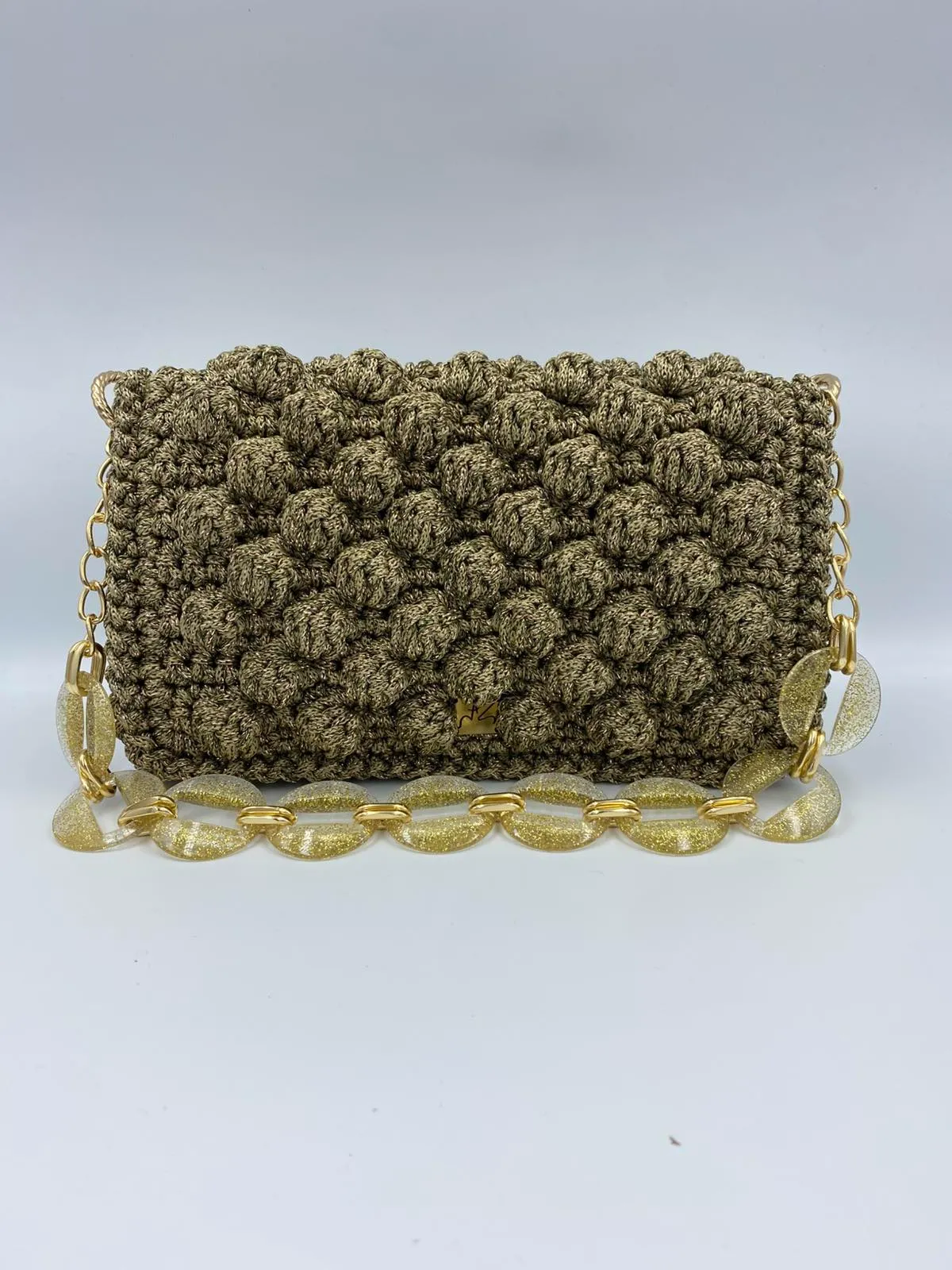 Προσθέστε μια πινελιά τέχνης στην εμφάνισή σας με αυτή την εκπληκτική χειροποίητη τσάντα, κροσέ, για όσους εκτιμούν το μοναδικό σχεδιασμό και την εξαιρετική δεξιοτεχνία. Η απαλή υφή του που μοιάζει με φυσαλίδες και το έντονο λουράκι με αλυσίδα δημιουργούν μια μοντέρνα αλλά και διαχρονική αισθητική.