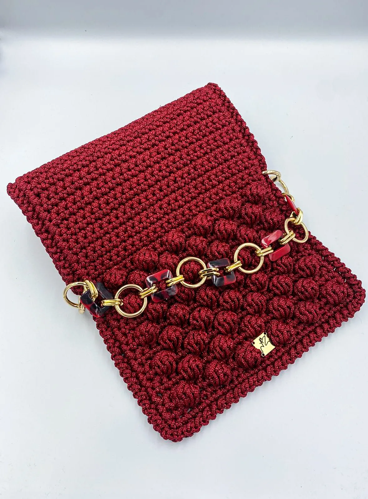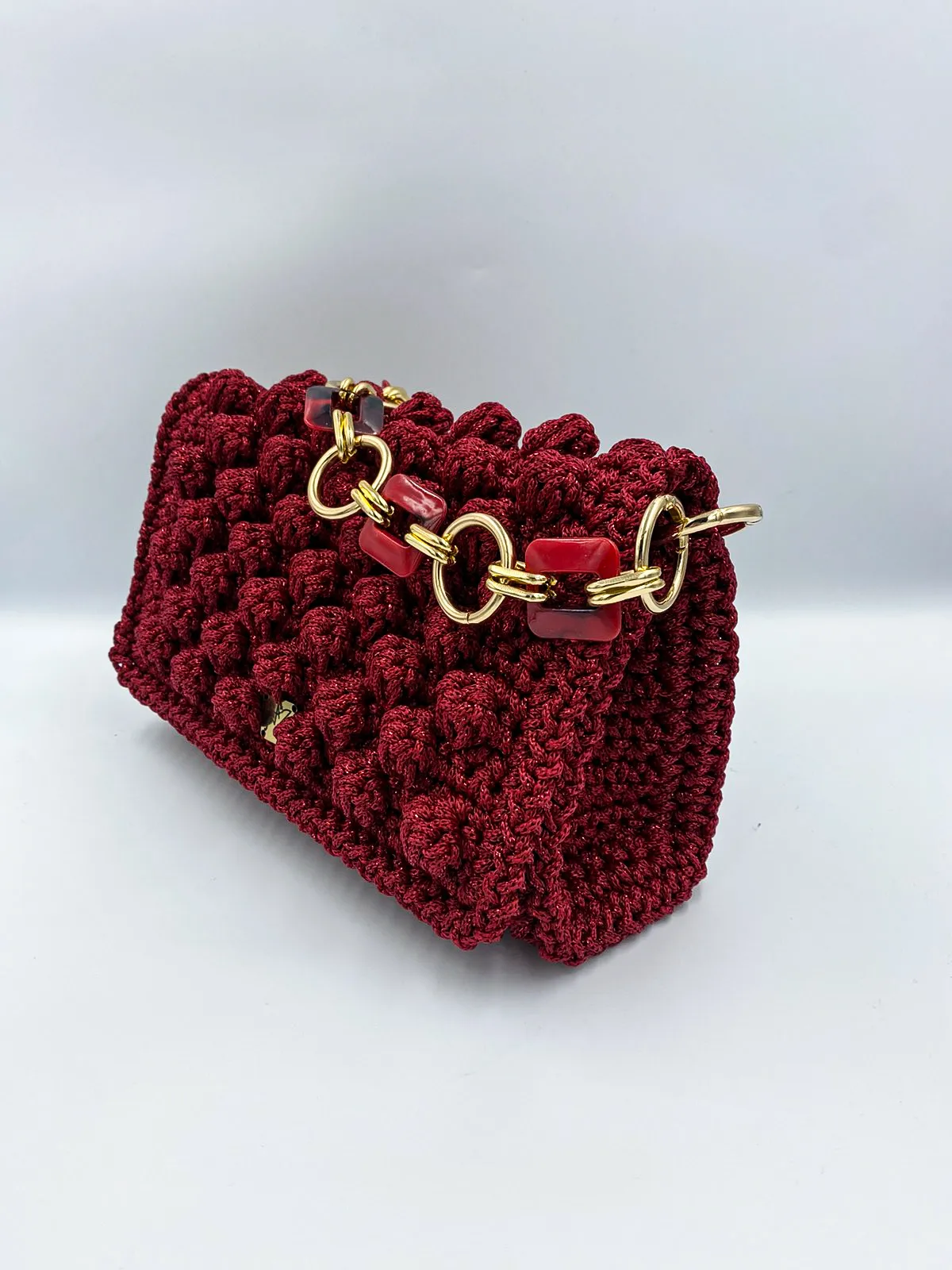Προσθέστε μια πινελιά τέχνης στην εμφάνισή σας με αυτή την εκπληκτική χειροποίητη τσάντα, κροσέ, για όσους εκτιμούν το μοναδικό σχεδιασμό και την εξαιρετική δεξιοτεχνία. Η απαλή υφή του που μοιάζει με φυσαλίδες και το έντονο λουράκι με αλυσίδα δημιουργούν μια μοντέρνα αλλά και διαχρονική αισθητική.