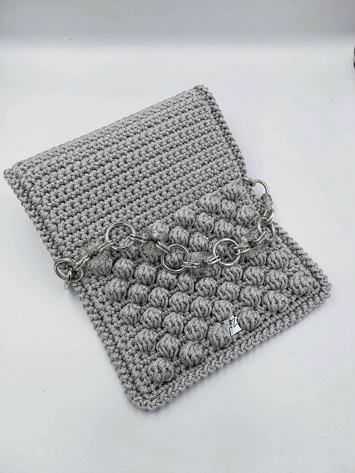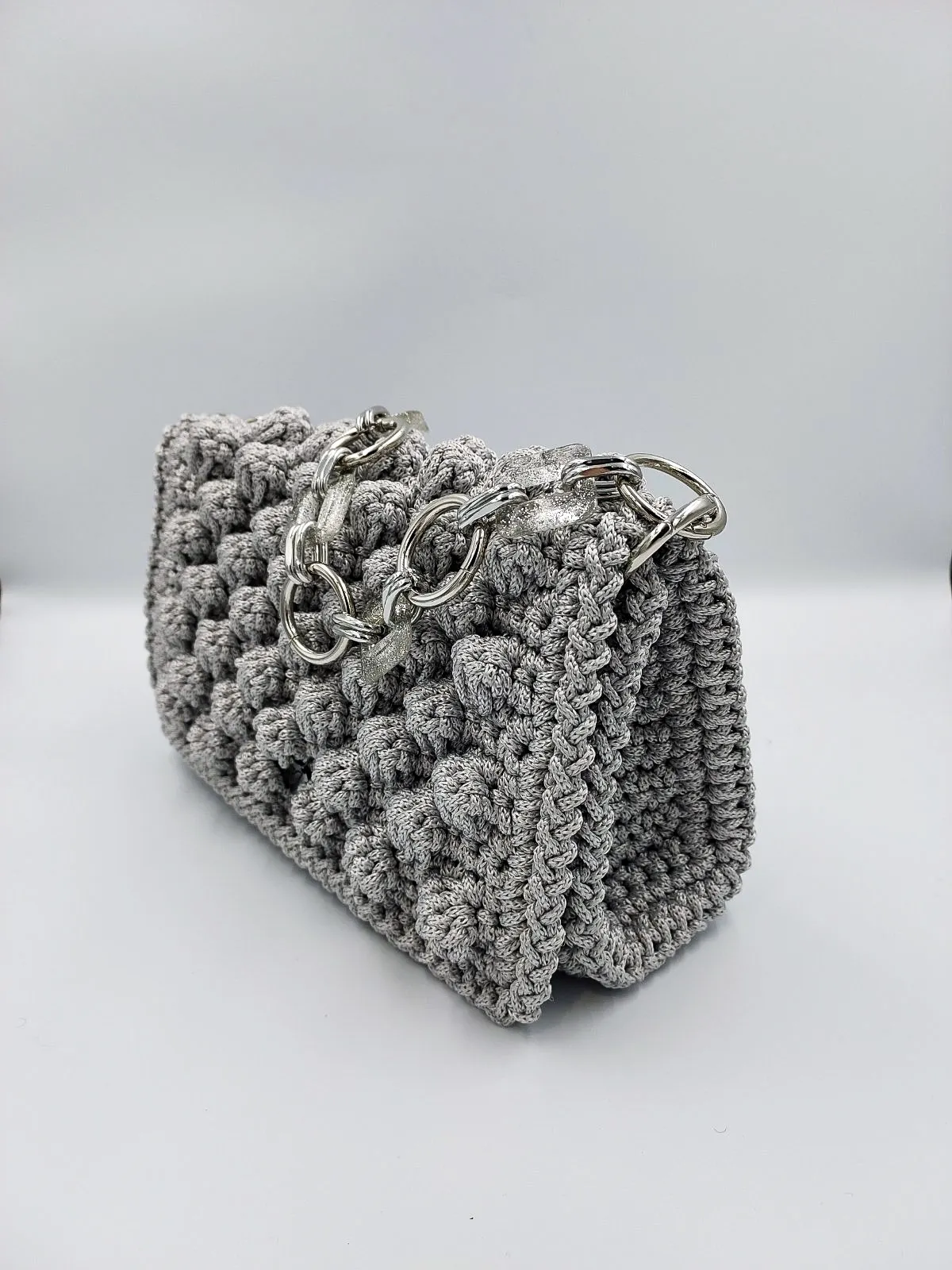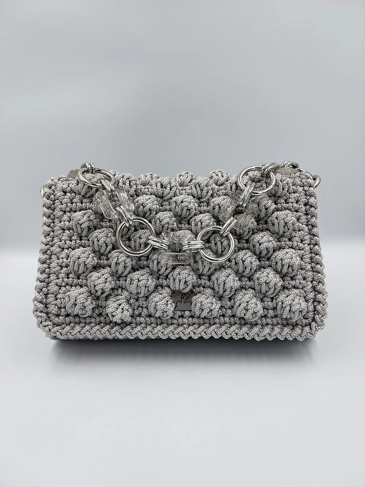 Προσθέστε μια πινελιά τέχνης στην εμφάνισή σας με αυτή την εκπληκτική χειροποίητη τσάντα, κροσέ για όσους εκτιμούν το μοναδικό σχεδιασμό και την εκλεπτυσμένη κατασκευή. Η απαλή, φουσκωτή υφή της και το έντονο λουράκι της αλυσίδας δημιουργούν μια μοντέρνα αλλά και διαχρονική αισθητική.
