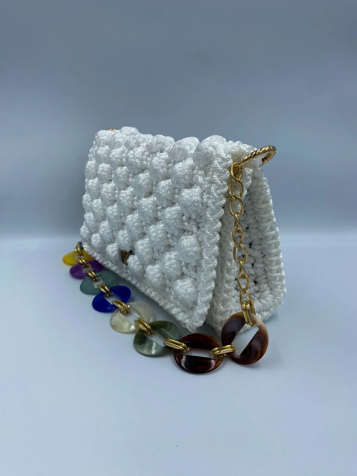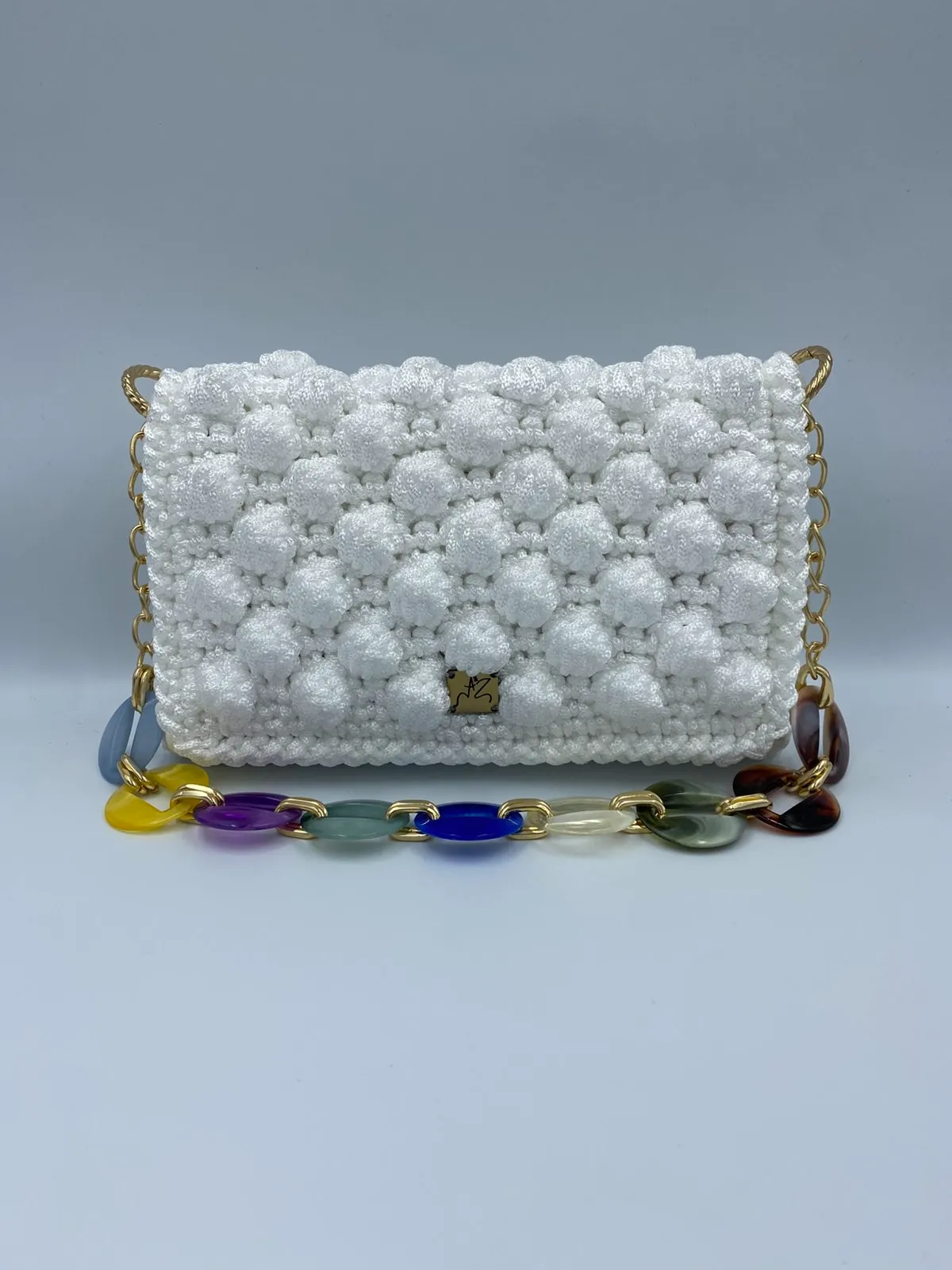 Προσθέστε μια πινελιά τέχνης στην εμφάνισή σας με αυτή την εκπληκτική χειροποίητη τσάντα, κροσέ για όσους εκτιμούν το μοναδικό σχεδιασμό και την εκλεπτυσμένη κατασκευή. Η απαλή, φουσκωτή υφή της και το έντονο λουράκι της αλυσίδας δημιουργούν μια μοντέρνα αλλά και διαχρονική αισθητική.